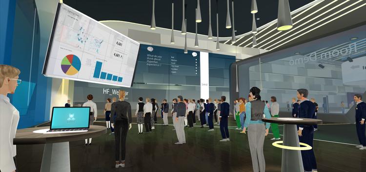 Visitors, represented by their customized avatars, interact with other attendees or exhibitors by chat, visio or by exchanging files and documents.