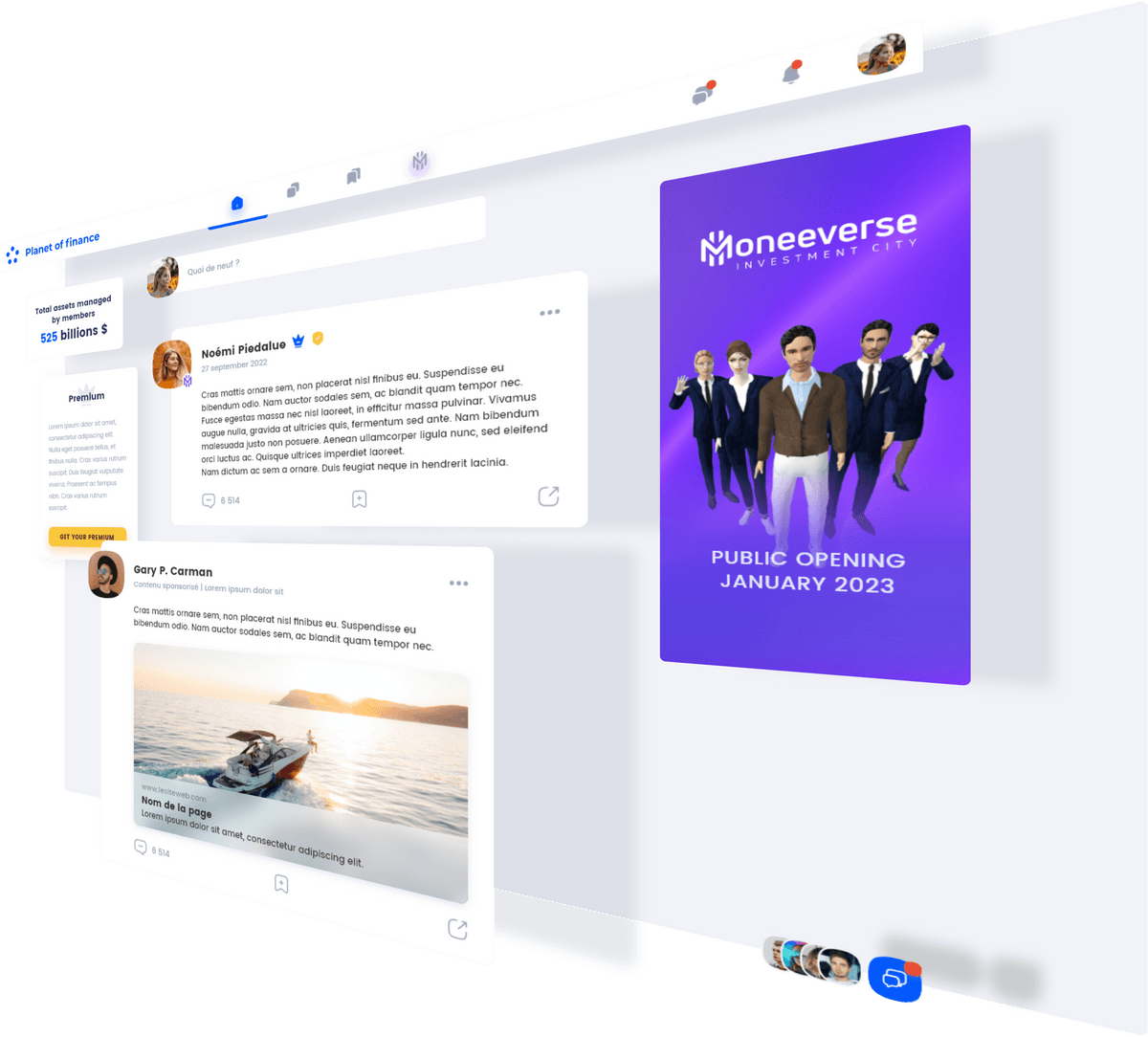 Moneeverse is a metaverse platform designed as a 24/7 exhibition place for Banks, Asset Management Institutions, online Trading companies, Fintechs, Cryptos and Luxury Brands. Designed in a fluid and realistic way, Moneeverse welcomes visitors around a reception desk, thematic pavilions, customized exhibitors showrooms, a large auditorium and cosy meeting areas.